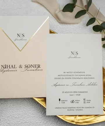 - Davetiyeler görselde görüldüğü gibidir, ilave zarf veya aksesuar içermemektedir. Zarflı modeller için zarf bedeli fiyata dâhildir. Bazı davetiye modellerinde tasarımlarından kaynaklı zarf bulunmamaktadır. Baskı yapılan alan katlama vb. işlemler sayesinde zarf görevi de görmektedir.