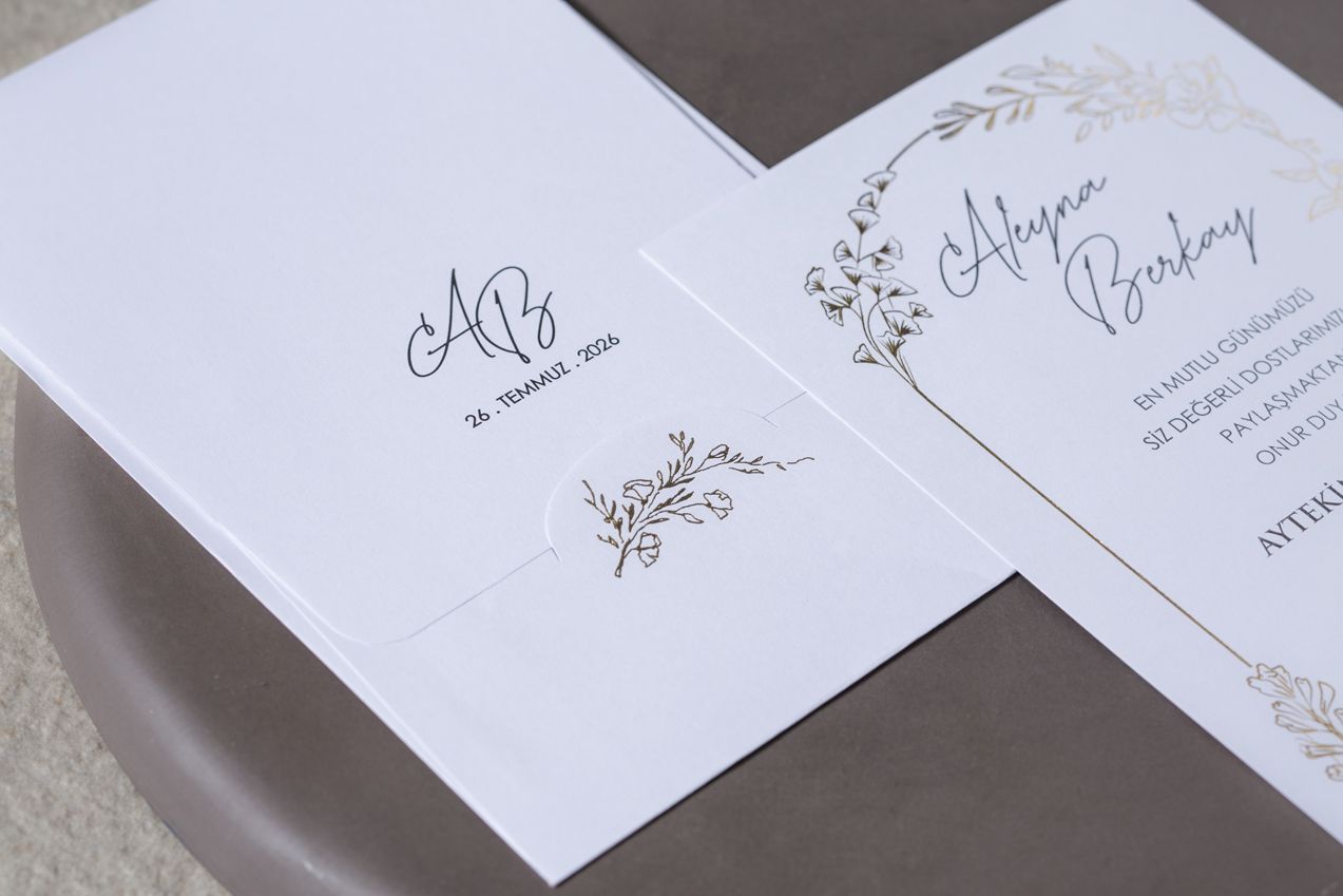 - Davetiyeler görselde görüldüğü gibidir, ilave zarf veya aksesuar içermemektedir. Zarflı modeller için zarf bedeli fiyata dâhildir. Bazı davetiye modellerinde tasarımlarından kaynaklı zarf bulunmamaktadır. Baskı yapılan alan katlama vb. işlemler sayesinde zarf görevi de görmektedir.